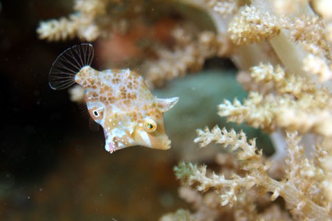 まずは、ソフトコーラルの合間をゆらゆらと漂っていたカワハギのおちびちゃんです。