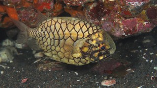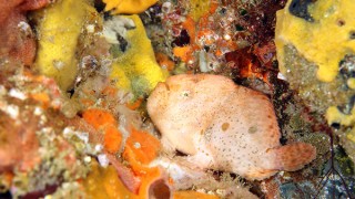 岩のくぼみにカエルアンコウのペアがいました。少し離れていたので一緒のところは撮れませんでしたが、こちらはメスでお腹もちょっとぷっくり。こっちはオス。これだとちょっとひっそり感が出ないので、、、ライトだけで怪しい雰囲気を出してみました。